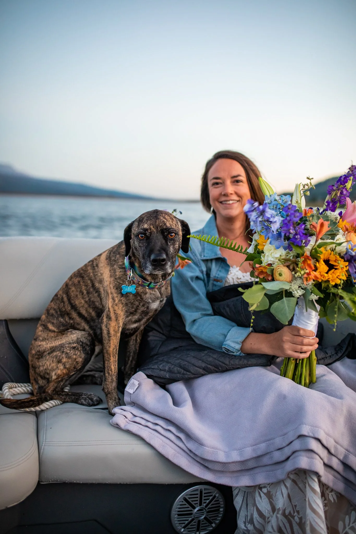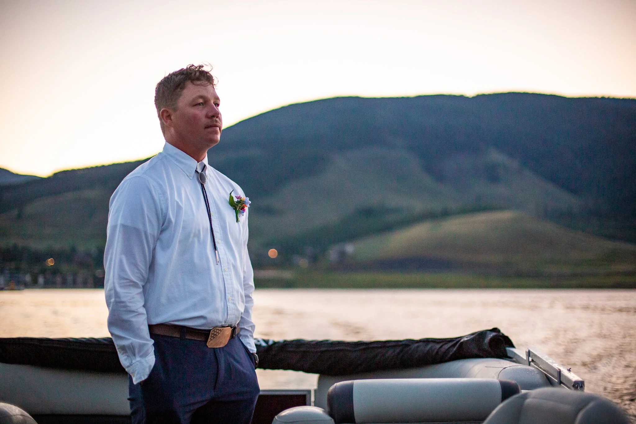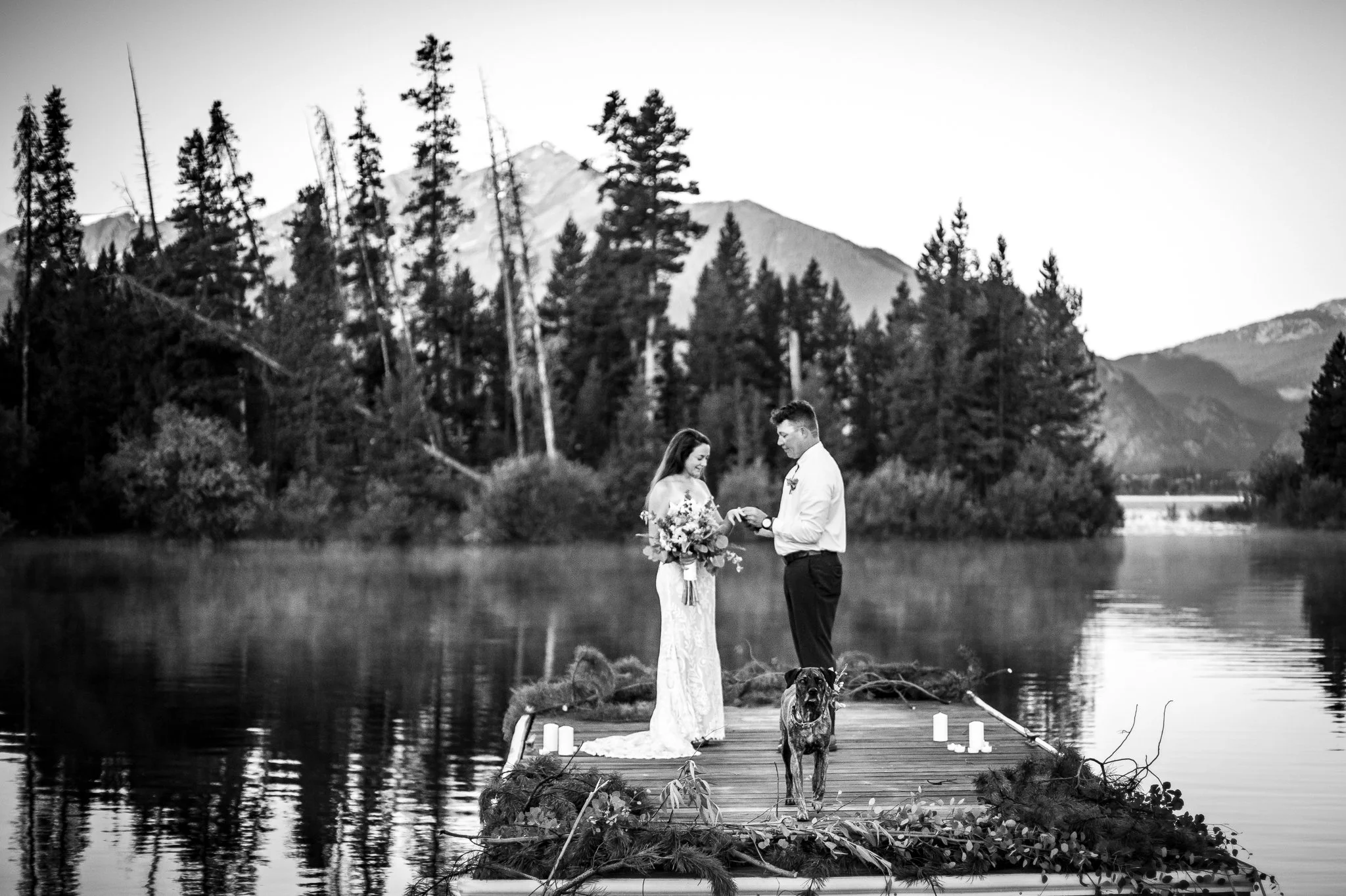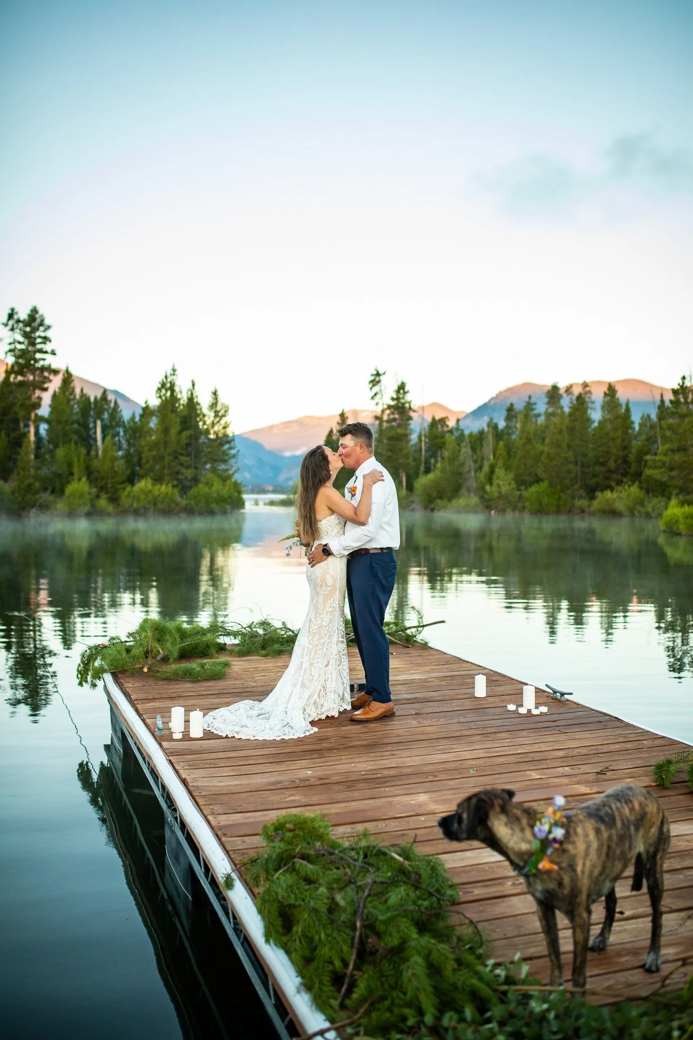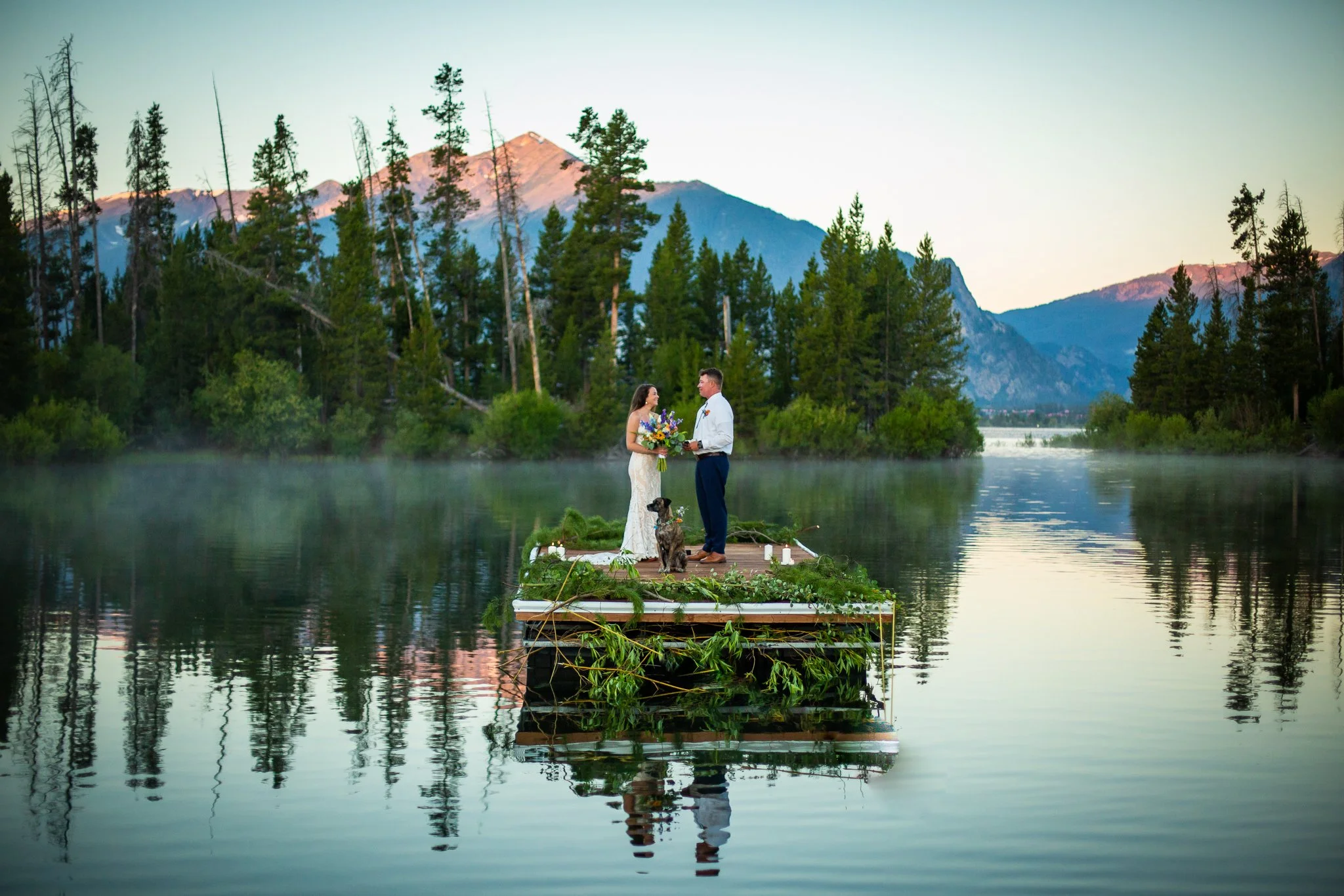 Phil dragged a dock out to a special spot the night before. We woke up at 4am and took a pontoon boat out to it so they could say their vows as the sun rose over the Ten Mile Range. The mist coming off the water made everything look & feel so magical. The Ten Mile Range turned pink as the sun came up. Their dog Darby was their witness and they married themselves in the most intentional way that was so them. We explored an island on the lake, then headed back to have breakfast.