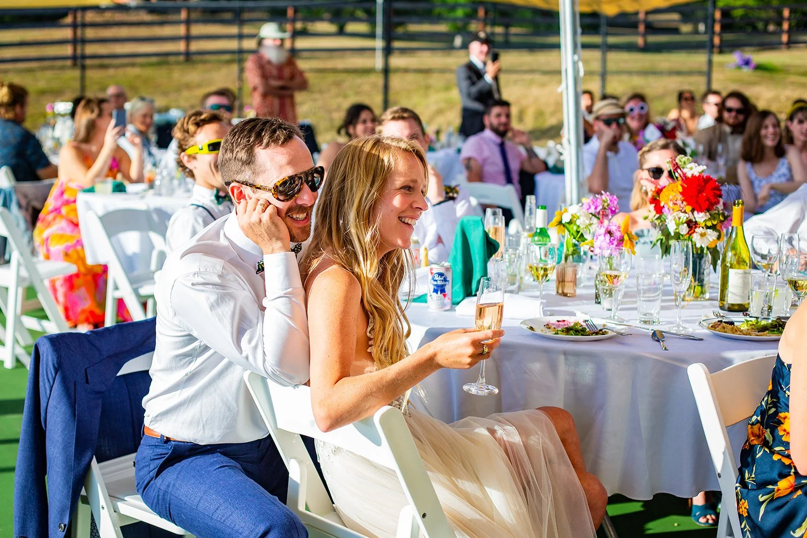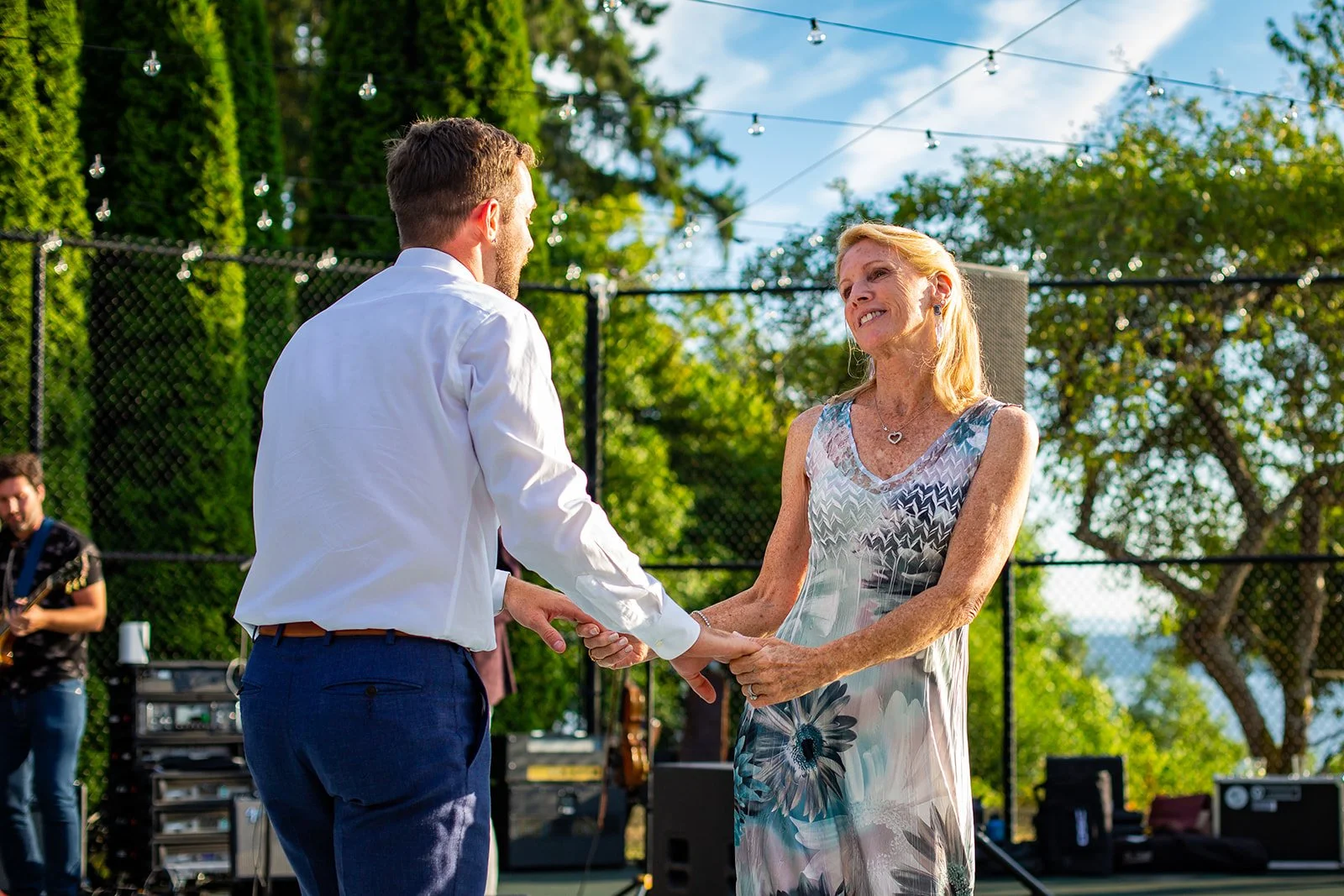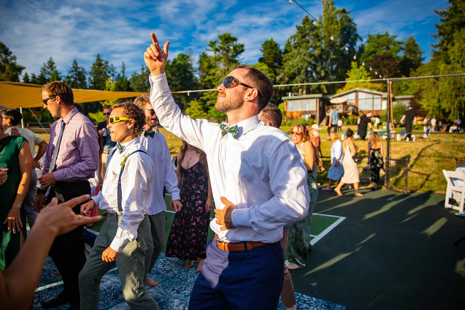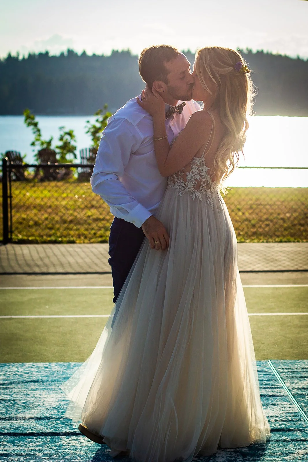 The tennis court was transformed into an incredible reception venue. A big beautiful blue rug made up the dance floor. Everyone took their seats at the tables to have dinner and listen to the toasts from the bride & groom’s parents & siblings. Then they did their first dances, and opened up the dance floor for some golden hour jams! The dance floor was high energy. The Shakedown Band from Seattle really threw down and everyone was loving it. Halfway through golden hour, I took Kristin & Dan down to the beach for some newlywed photos, and then we spent the rest of the night dancing and partying with their friends. It was so much fun!